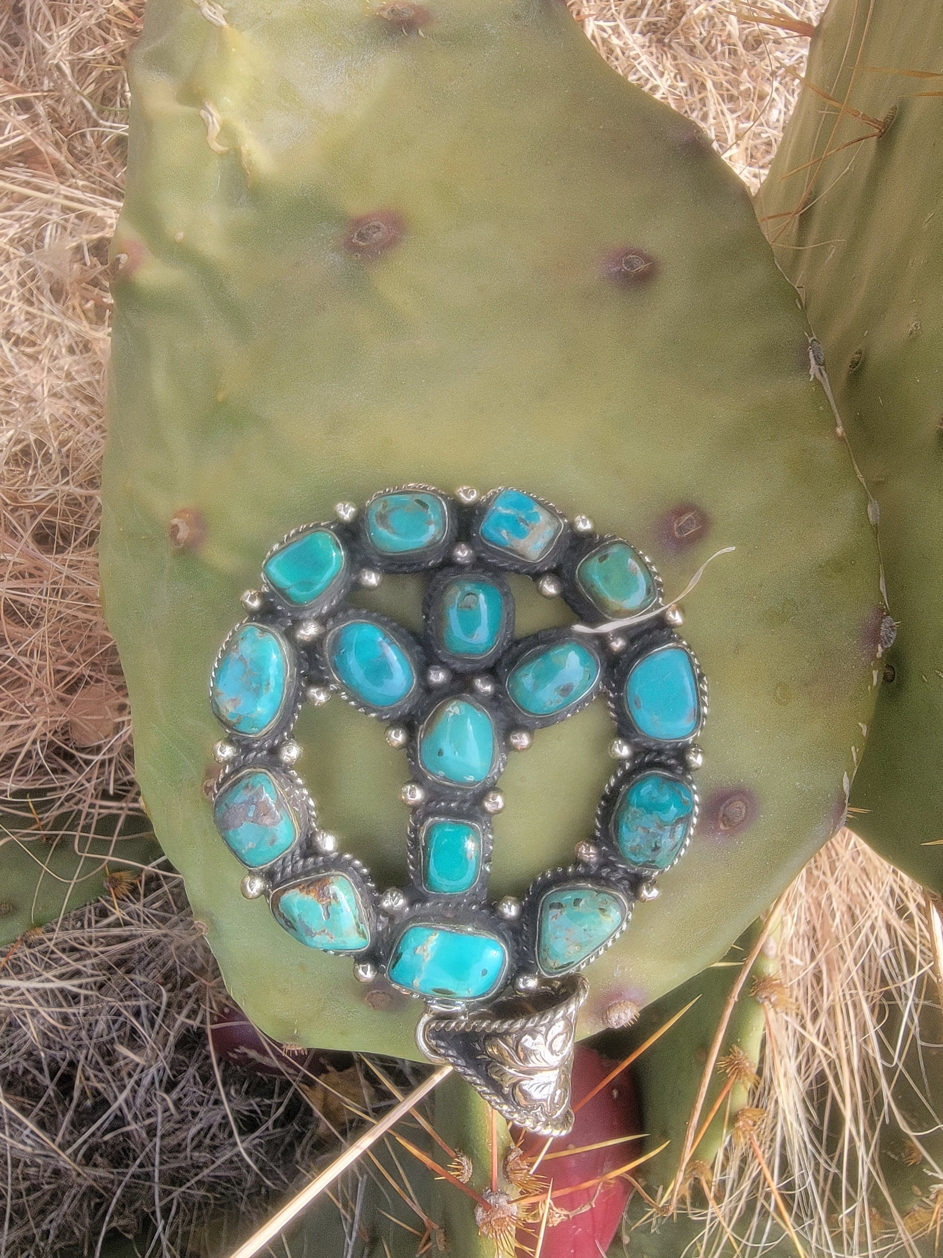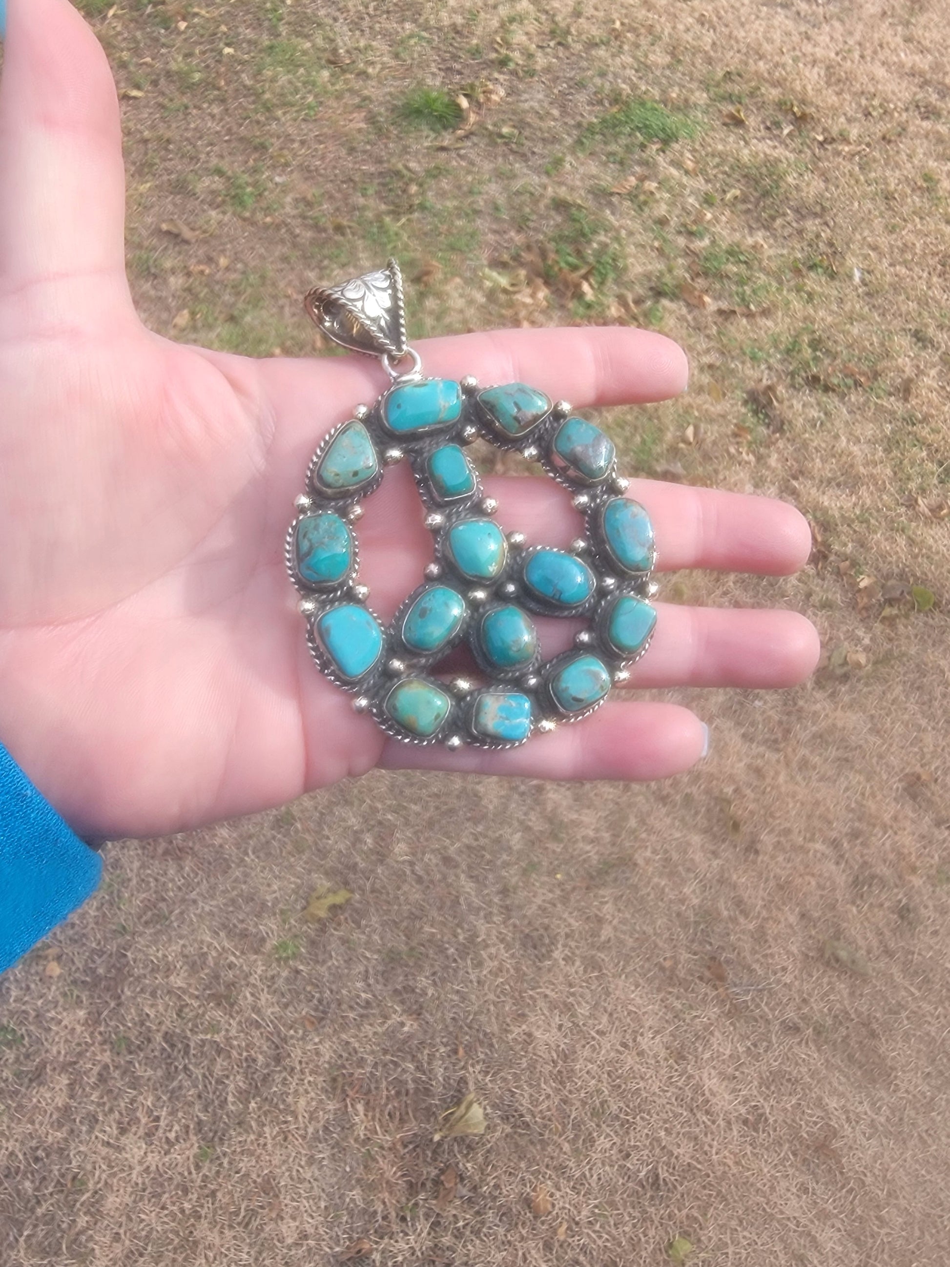 This exceptionally large peace sign boasts 16 'blue' turquoise stones, ensuring it will be the standout piece in your jewelry stack.